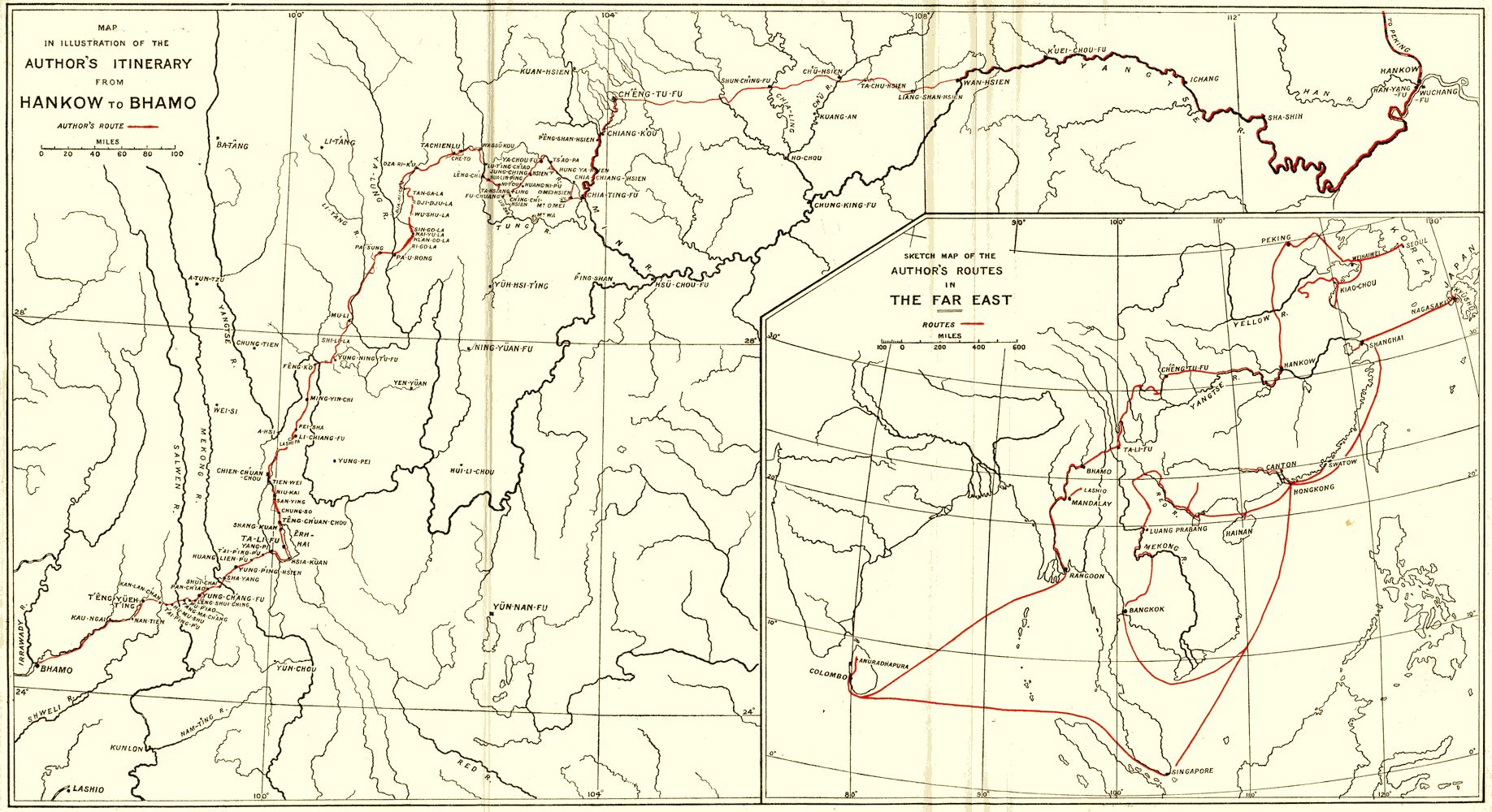 - From Peking to Mandalay: A Journey from North China to Burma Through Tibetan Ssuchʻuan and Yunnan by R F Johnston 1908 Archive.org. Incomplete map. Map from the Gutenberg.org edition.